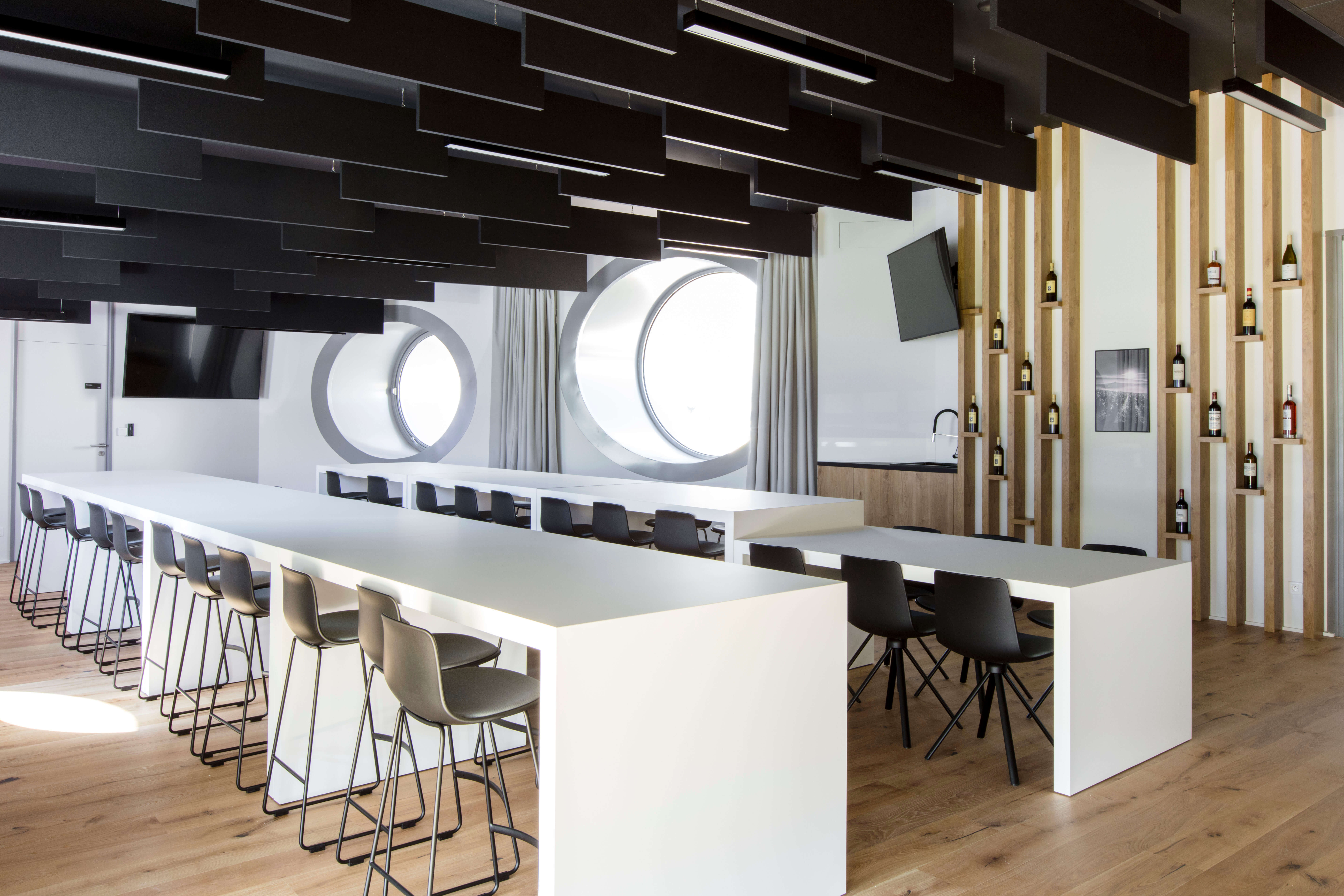 Petits espaces de travail : bloc ossature bois recouvert de Corian blanc, habillage intérieur en panneaux épicéa perforés, table Corian sur ossature métallique, assise et dossier Sky blanc, intégration éclairage et bloc prise sur table. Ensemble assemblé sur place au 5ème étage.